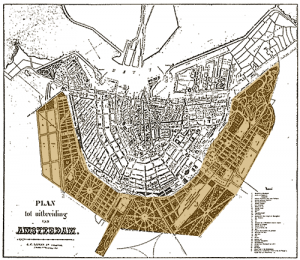 アムステルダムの繁栄に陰りが見え始めた18~19世紀には公衆衛生や住宅事情が悪化し、都市環境問題が深刻化となりました。そこで旧市街の外側への都市拡張計画が進み、手始めとしてファン・ニッフトリック案が持ち上がりました。