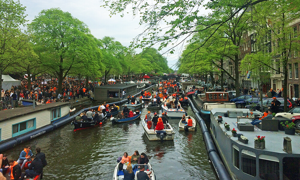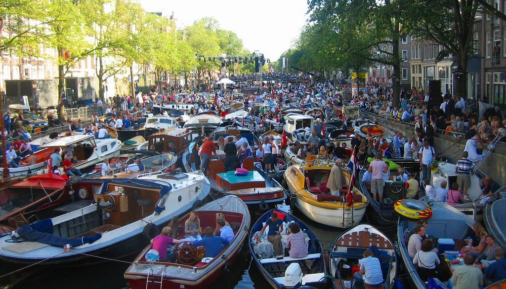 キングスデーの日の運河はボートで埋め尽くされます。貸し出しボートやパーティーボートは人気があるので早くから予約が必要です。ボートの上がパーティー会場となるので爆音のミュージックが終日運河から聞こえてきます。
