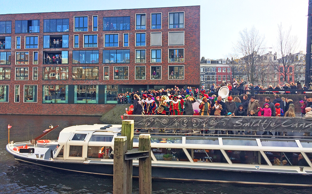 シンタクラースのパレードの日は運河の跳ね橋があがり、一部通行止めとなるので交通機関が麻痺します。運河パレードの船を子供たちが走って追いかけ、その子供たちを追ってお父さんが走りまわる日です。