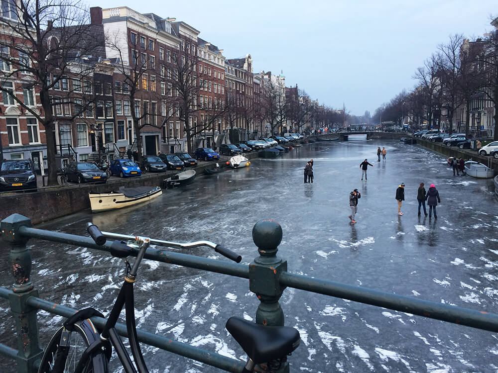 冬のオランダは氷点下になることもしばしばあります。そして時には寒波が到来し運河が凍ります。凍った運河の上でスケートをするのはオランダ人あるあるです。毎年見られるわけではないのでレアな光景です。