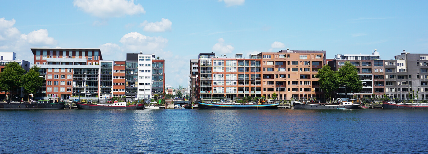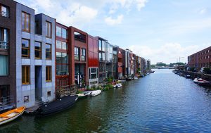 水辺に並ぶ住宅群はまるで現代版の運河の家。小さな住宅が高密度で隣接しているこのエリアはアムステルダム旧市街の街並みとの類似性を一番感じます。