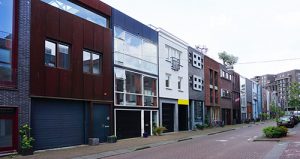 各低層住戸は道路側のみが外と面していて、両サイドは隣の家と隣接しているというオランダスタイルの住宅デザインです。