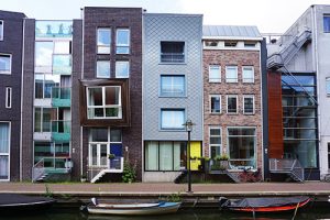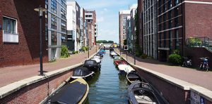 水辺に並ぶ住宅群はまるで現代版の運河の家。小さな住宅が高密度で隣接しているこのエリアはアムステルダム旧市街の街並みとの類似性を一番感じます。
