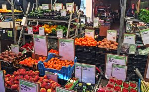 マーケットに並ぶ食品はどれも新鮮です。八百屋さんでは日本では見たことのない平べったい桃やリコーダーサイズのアスパラガス、青紫色のトマト、ズッキーニより大きい茄子などと目新しい野菜鑑賞を楽しめます。