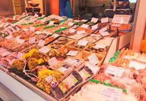 お魚屋さんでは新鮮な魚介類がぎっしり並びます。