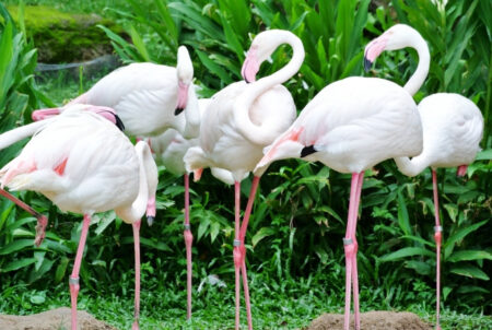 動物園の入口にある池にはいつもフラミンゴが集まっています。園内ではライオンやゾウやシマウマなどと定番の動物たちをみることができます。