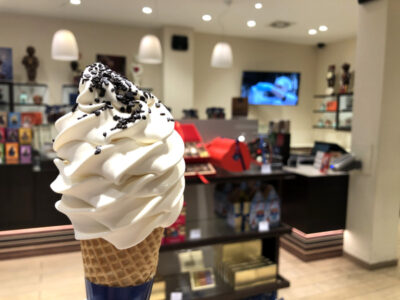 レオニダスは他の高級ブランドよりお手軽に買える商品が多く、今でも気軽に買えるチョコ屋さんとして大人気です。店頭で販売しているソフトクリームはコーンの内側がチョココーティングされていて最後まで美味しいソフトクリームです。お試しあれ!