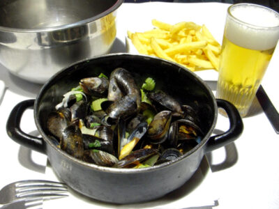 そしてベルギーはムール貝も有名です。Moules-frites(ムール・フリット)と呼ばれるベルギー料理は、ムール貝をおかずにフライドポテトを食べる定食的なスタイル。