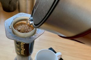 コーヒーとお湯を入れ、金属フィルターを押し沈めたらあとは注ぐだけ。