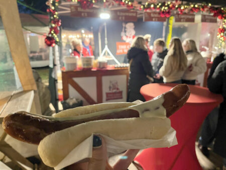 焼きたてのチーズ入りソーセージを挟んだチーズホットドッグ。冬の外で食べる屋台フードは本当に最強。