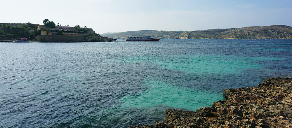 フェリーで約20分ほどでコミノ島のビーチ・ブルーラグーンに到着します。