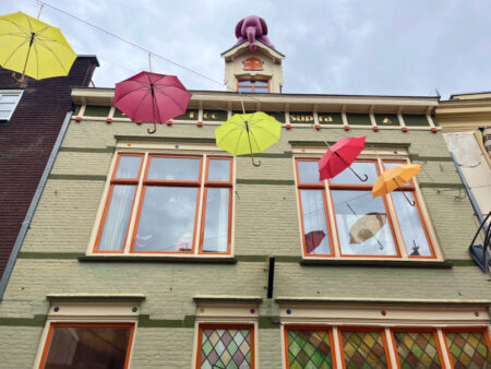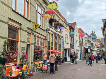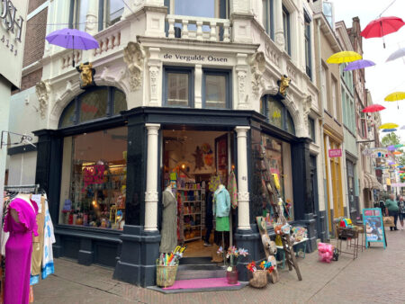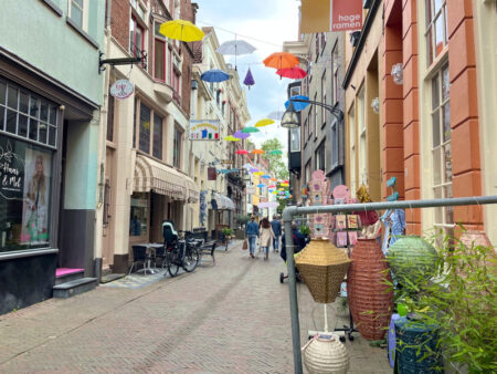 カラフルな傘が吊るされたクライネ・オーフェル通り(Kleine Overstraat)には、たくさんの雑貨屋さんが並んでいます。