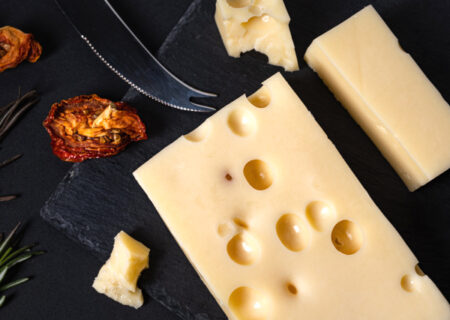 熟成の速度が速いため熟成中にポコポコと空洞ができるのが特徴で、見た目はアニメに出てくるチーズそのものです。そのまま切って食べたり、ピザにのせたり、チーズフォンデュにも使われます。