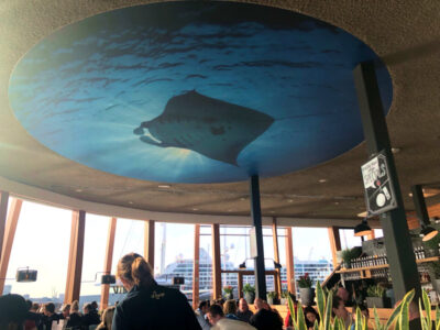 アムステルダム・ノードにあるLoetje Amsterdam aan ‘t IJは、アムステルダムを流れるアイ川に面しており、建物の川側は全面ガラス張りの解放感があるインテリア。さらに天井にエイが描かれています。