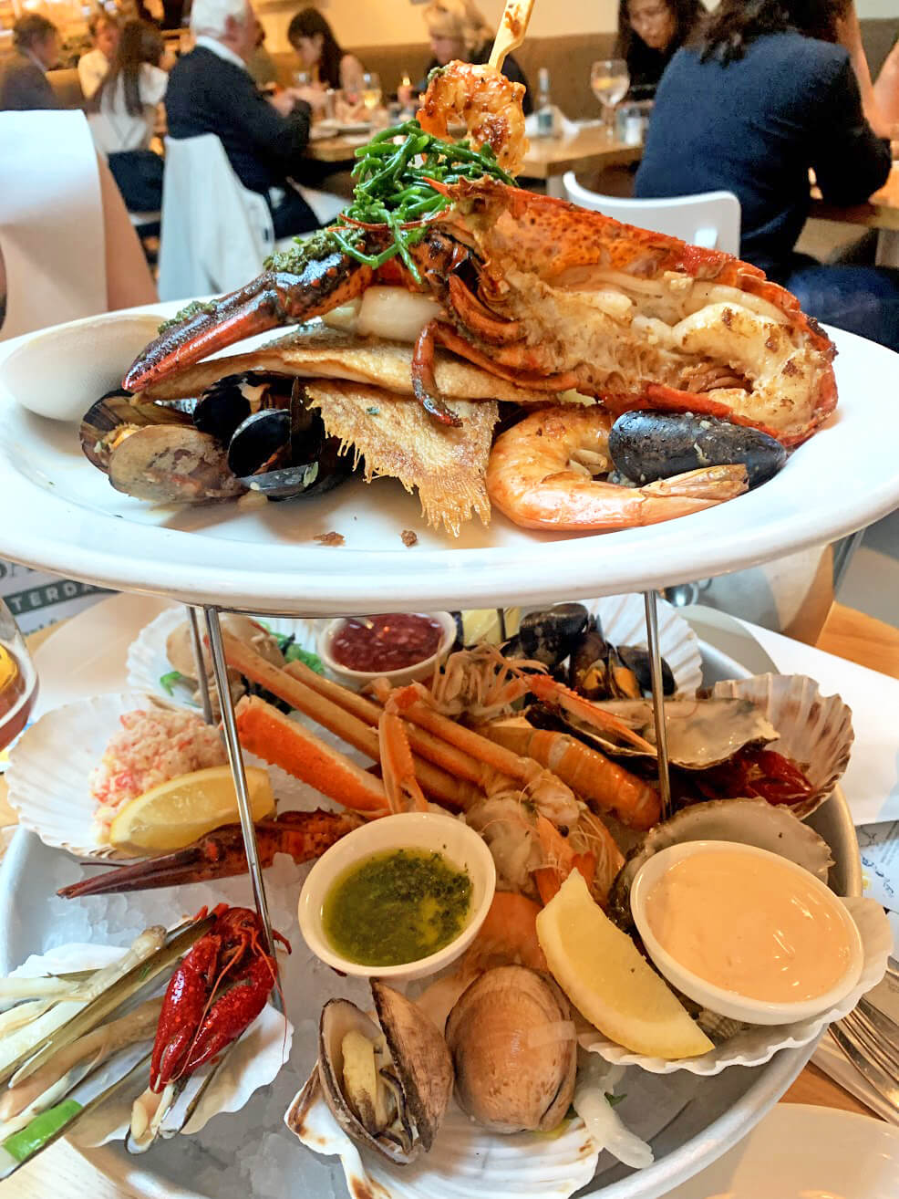 上段がロブスターをメインとしたシーフードのグリルで、下段がボイルされたエビやカニ、ムール貝やマテ貝なども入っており、バジルソースなどでディップして食べます。
