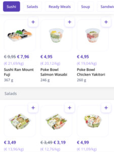 お寿司やサラダ、パスタなどの直ぐに食べれる商品があったのは驚きです。お寿司が割引されていたので買ってみました。購入したい時は商品写真右上の「+」をタップするとカゴに入れる事ができます。