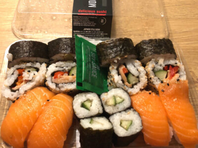お寿司は夕ご飯にいただきました。お魚はサーモンだけでしたけど美味しかったです。醤油とわさびも付いてたので満足しました。