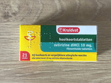 ドラッグストアのKruidvatでのみセチリジン成分の薬をプライベートブランドで販売しています。筆者はこれを服用しています。数ヶ月間と長期で服用するので低価格で購入できるのはありがたいです。(21錠で€4.50)
