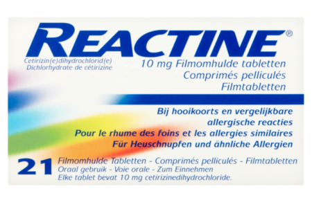 セチリジン成分の代表的な市販薬がREACTINEです。(21錠で€14)