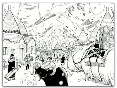 <ワンピース15巻より引用>冬島ドラム島のビッグホーンの町並み