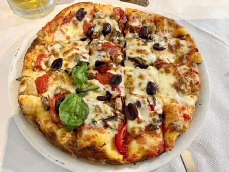 トラパニでまず食べてほしいのがここ!石窯で焼かれたピザは、生地がもちもちサクサクで感動の美味しさ。ミディアムサイズでも日本のLサイズくらいあって、10ユーロ前後で大満足。細かくカットされているので食べやすさも◎