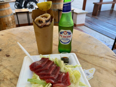 港にある鮮魚店兼バーで、新鮮なマグロをオリーブオイルで味わえるお刺身が絶品!揚げたての小魚&イカのフリットも最高で、ビールが止まりません。