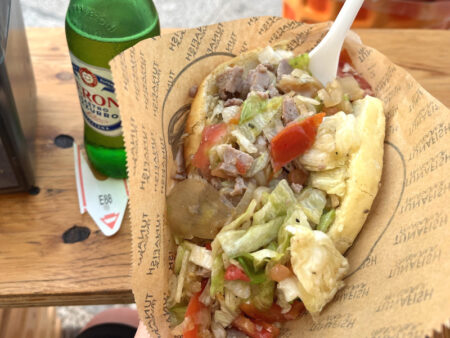 マグロ×ケバブ」という意外な組み合わせだけど、野菜たっぷりでヘルシーな一品。旅行中の野菜不足解消にもぴったりで、サクッと食べられるのが◎
