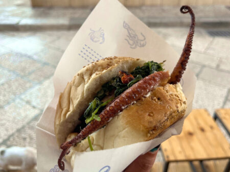 名前の通り、タコを挟んだバーガー。ぷりぷりのタコとクリーミーなソースの相性が抜群で、思わずもう一個頼みたくなるほど。