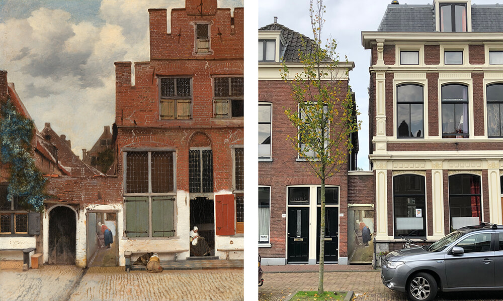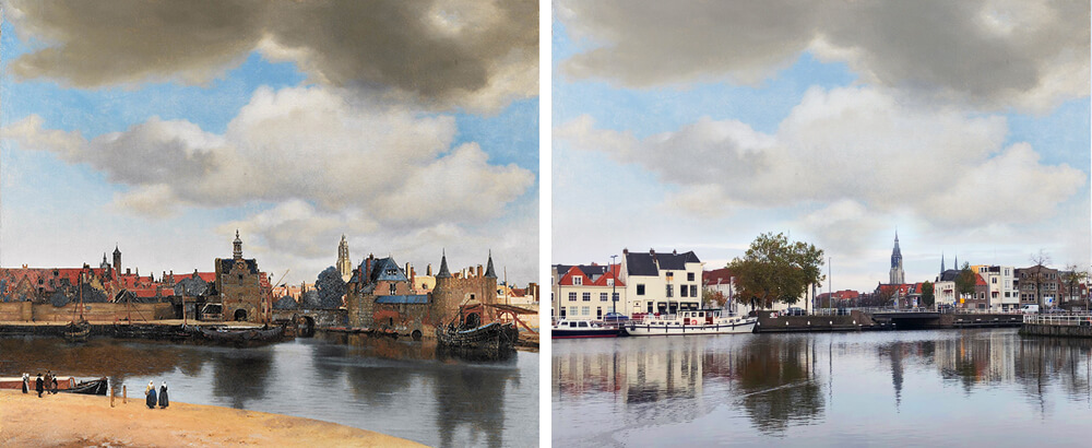 <名作「デルフトの眺望」(左)と実際の場所の写真(右)>