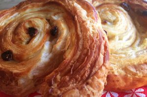 デニッシュ生地を薄く伸ばし、その上にカスタードとレーズンをのせ、ロールケーキのように巻いてから1cm幅にスライスして焼き上げるので、ペロペロキャンディーのようなグルグル巻きの形が特徴です。