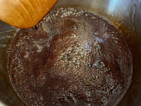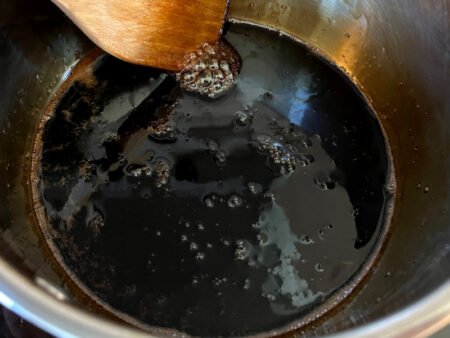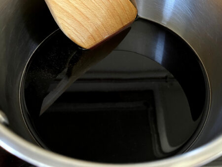 煮詰まったら火を止めます。光沢のあるキレイな黒光。これで黒蜜の完成です。