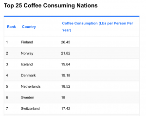 ちなみに世界ランク第1位のフィンランド人は1人あたり年間約12kgのコーヒーを消費しています。