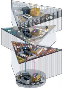 基礎と一番下の三角形部分までは高強度のコンクリートですが、上2つの三角形部分は普通のコンクリートを使っています。外周部分はキャンチレバー(片持ち梁)となっていますが、スチール製の補強材が支柱から吊り下げられ、最大で20メートルの突き出た三角形の一番尖った部分のフロアを支えています。それでも床が少し下がってしまうのを防ぐために、施工時には2cmほど上げて施行されています。わずか2cmでも、床が厚くなれば重量も変わり、構造負荷も変わりと、現場合わせの床上げは難攻したそうです。そのためエレベーターシャフトのコンクリートは構造計算上よりも無駄に厚い壁となっているとか。