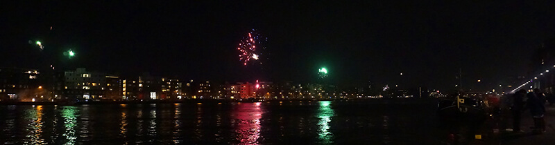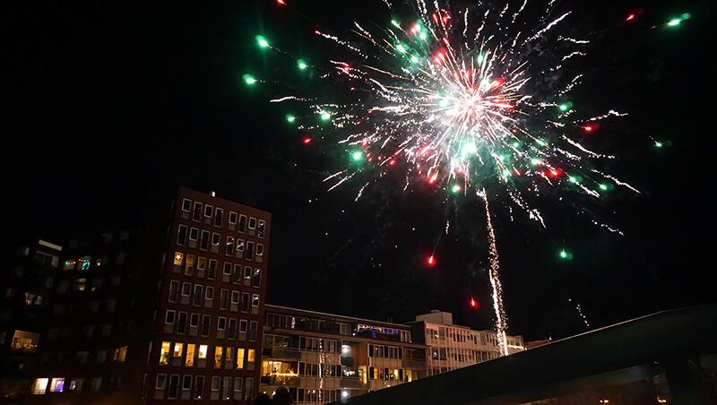 アムステルダムのニューイヤー花火は、至る所で行われます。0時とともに花火が上がり、10〜20分くらい止まることなく、とにかく花火。日本の花火大会とは大きく異なり、質より量。長いところでは1時間くらい上がり続け、帰るタイミングを見失います。そして花火が終わると一斉に帰ります。けっこうあっさりと。