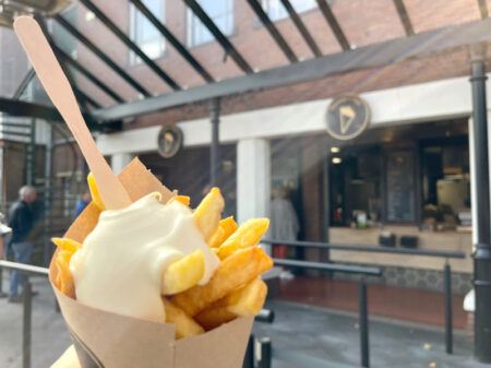 アウトレットを一周まわっただけでお腹が空いたので、オランダ定番のフリッツ(フライドポテト)で一休み。アウトレットの入口付近にあったフリッツ屋さんは行列ができてました。並んででも食べたくなっちゃうオランダのフリッツあるあるです。