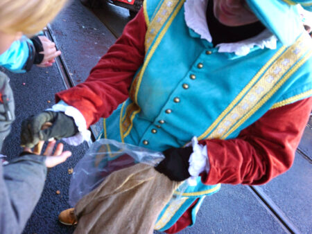 シンタクラースの登場が近づいてくると、袋を持ったピートたちがやってきて子供達にお菓子を配って周ります。
