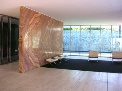 シンプルな空間設計、アクセントとなるように使われている高級素材(大理石)の壁面。今でこそ目新しさはないのですが、当時は新進気鋭なデザインで、その後にミースのデザインを真似する(参考にする)建物が増えたため、今でいったらシンプル系のデザインジャンルに当てはまって見えるように感じるんだと思われます。