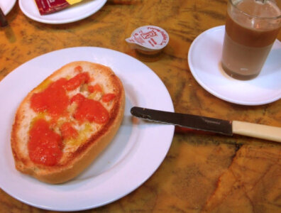 スライスすたフランスパンをトーストし、オリーブオイル、にんにく、トマトペーストをぬったパンのパンコントマテ(Pan con tomate)。スペインの典型的な朝食で、町のカフェならどこにでもあるメニューです。