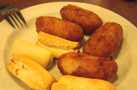 スペイン版コロッケのクロケッタ(Croqueta)は一口サイズで、ちょっと固めのクリームコロッケ。具は細かく刻んだ生ハムなのが多いです。