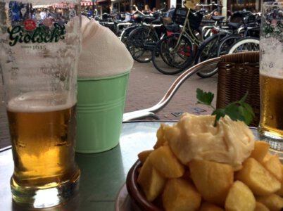 スペイン版フライドポテトのパタタスブラバス(Patatas bravas)はマヨネーズやケチャップではなくてオリジナルのアイオリソースがかかっていることが多いです。食べ出したらとまらない最高のおつまみです。