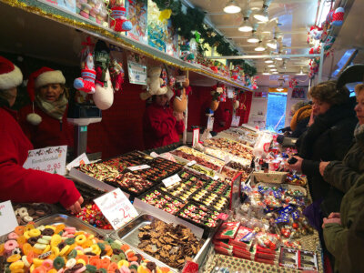 マーケットにはクリスマス用のモミの木や、デコレーション雑貨、リースやクリスマスカード、カラフルなチョコレートやキャンディーなどなど、キラキラしたものが沢山並んいます。